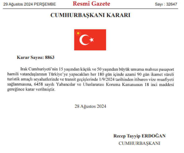 ANKARA (İGFA) – Irak Cumhuriyeti’nin 15 Yaşından Küçük ve 50 Yaşından Büyük Umuma Mahsus Pasaport Hamili Vatandaşlarının Türkiye’ye Yapacakları Her 180 Gün İçinde Azami 90 Gün İkamet Süreli Turistik Amaçlı Seyahatlerinde ve Transit Geçişlerinde 1/9/2024 Tarihinden İtibaren Vize Muafiyeti Sağlanması Hakkındaki Cumhurbaşkanı kararı bugünkü Resmi Gazete’de yayımlandı.