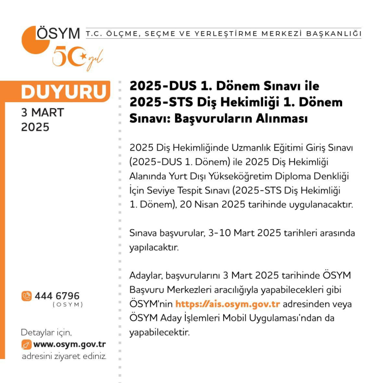 ÖSYM, 2025-DUS 1. Dönem Sınavı ile 2025-STS Diş Hekimliği 1. Dönem Sınavına yönelik başvuruların 10 Mart’a kadar alınacağını duyurdu.