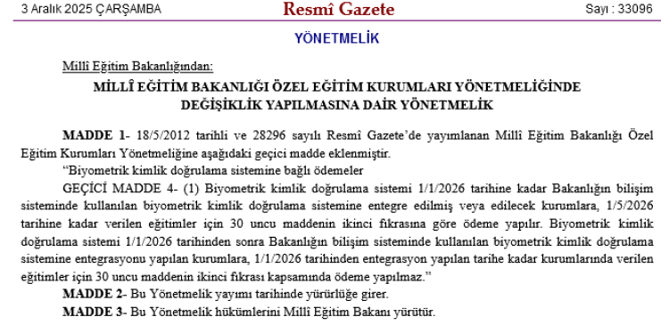 Değişiklikle birlikte, özel eğitim kurumlarında biyometrik kimlik doğrulama sisteminin kullanımına ilişkin önemli düzenlemeler yürürlüğe girdi.