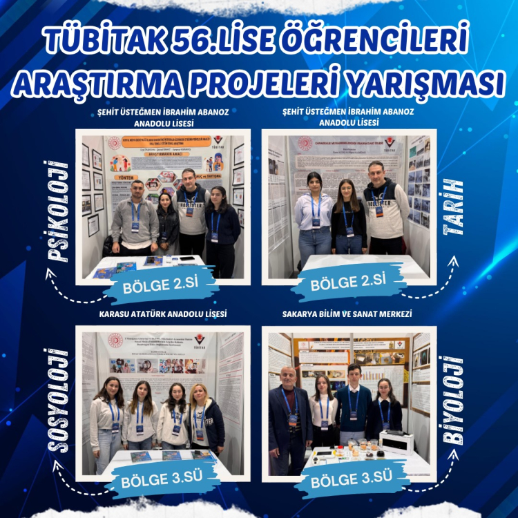 Türkiye genelinde 22 bin 586, İstanbul Asya bölgesinden ise bin 789 proje başvurusunun yapıldığı TÜBİTAK 56. Lise Öğrencileri Araştırma Projeleri Yarışması İstanbul Asya Bölge Finalleri Sergisinde dereceler belli oldu. Sakarya’dan liseli öğrenciler bölge finallerinde 4 derece elde etti.