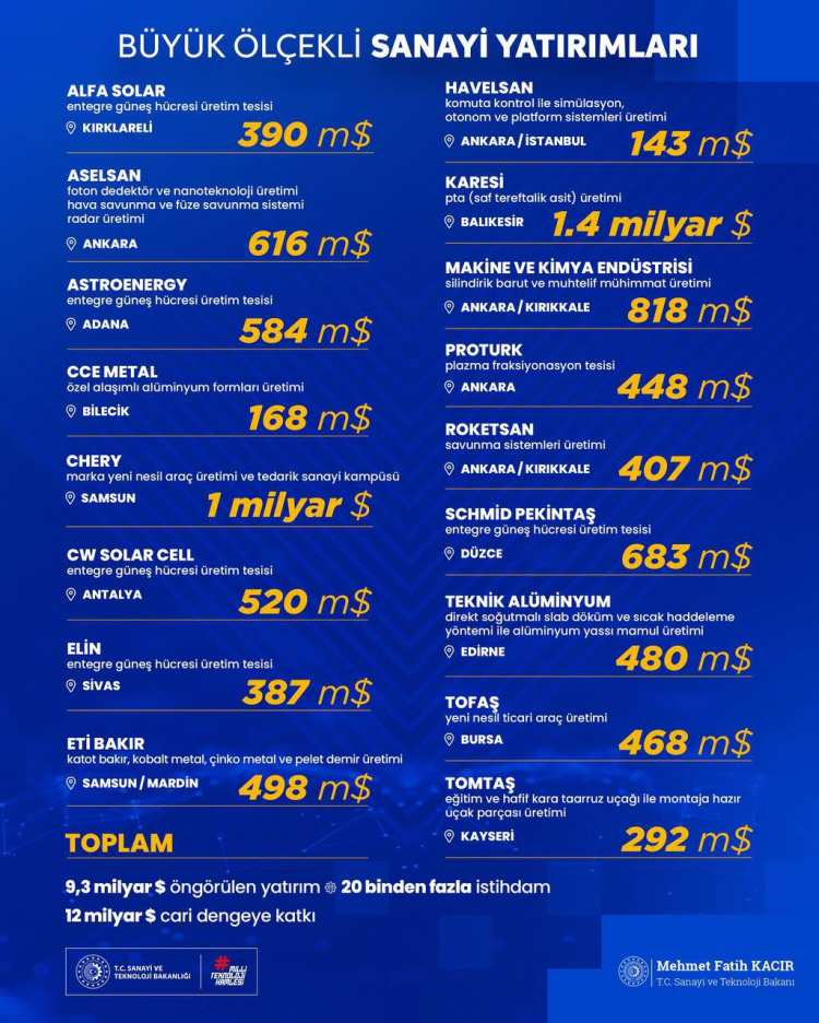 Toplamda 9,3 milyar dolarlık yatırım hacmine sahip olan bu projelerin Türkiye’nin yenilikçi teknolojilerdeki yükselişini ve hammadde arz güvenliğini pekiştireceğini kaydetti.