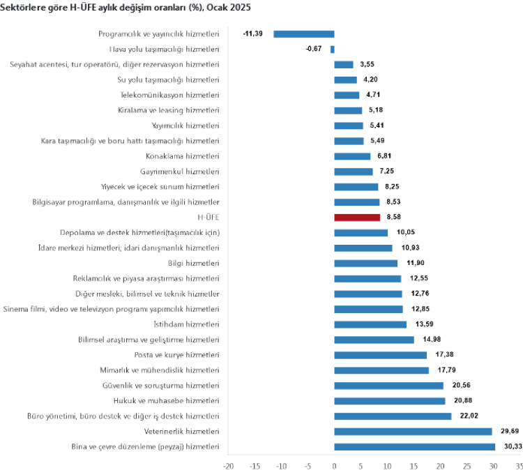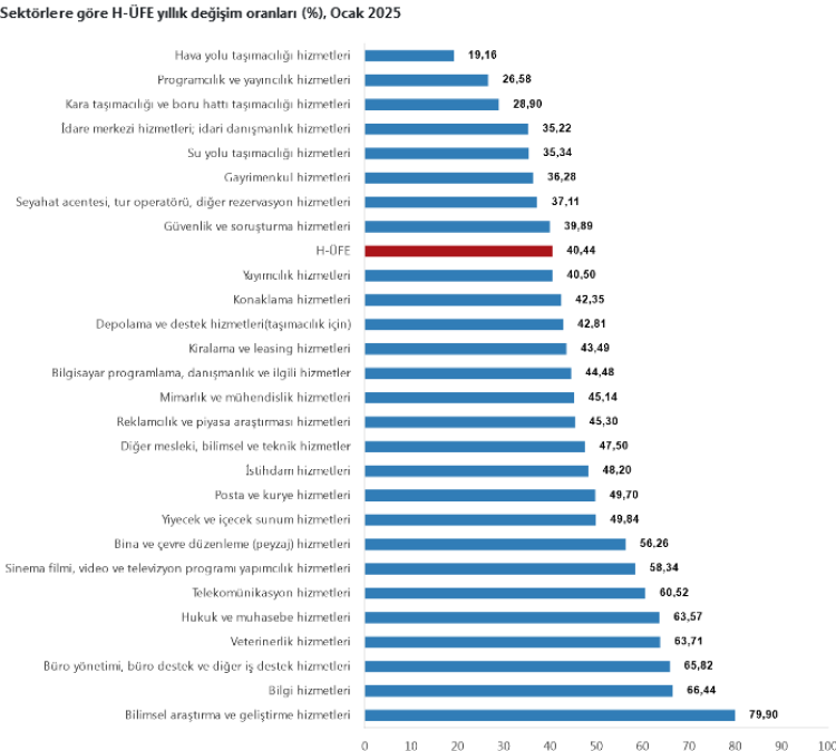Hizmet Üretici Fiyat Endeksi verilerine göre Ocak ayında sektör bazında en çok artış peyzaj hizmetlerinde olurken, yıllık bazda en çok değişim gösteren sektör bilimsel araştırma ve geliştirme hizmetleri oldu.