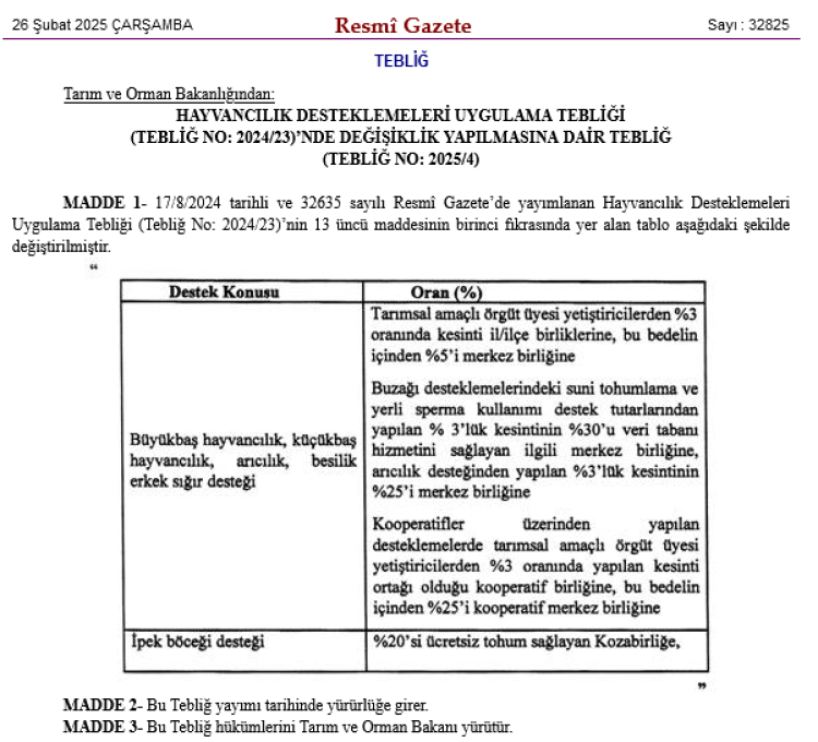 Tarım ve Orman Bakanlığı, hayvancılık desteklemelerinden çiftçinin üye olduğu üretici örgütlerine yapılan kesinti oranlarında, birinci derece tarımsal amaçlı örgüt ayrımı kaldırıldı.
