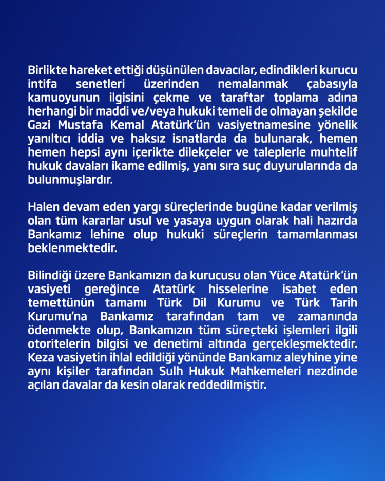 İşbankası, sosyal medyada “Kayyum atanacak” iddialarını sosyal medya üzerinden yapılan açıklamayla yalanladı.