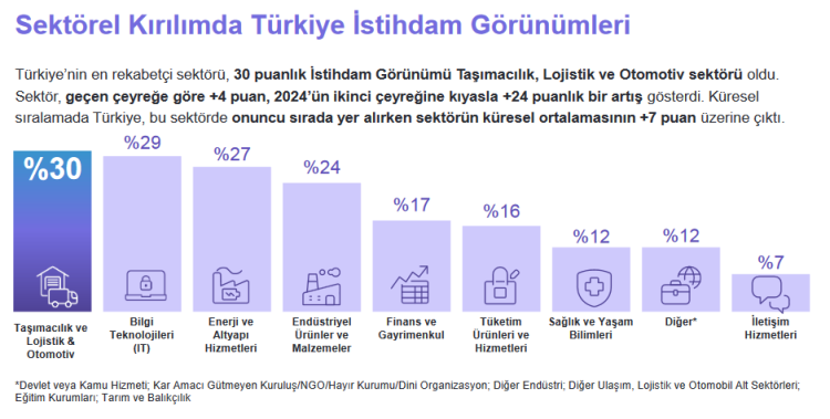 Türkiye’deki istihdam görünümü, geçen çeyreğe göre 5 puan ve 2024’ün ikinci çeyreğine kıyasla 8 puan güçlendi. Küresel çapta Türkiye, istihdam beklentileri açısından bu verilerle sıralamada üst yarıda yer aldı. İstihdam beklentilerindeki artışı da dikkat çeken Türkiye, küresel ortalama artışının 5 puan üzerinde bir yükseliş kaydederek işverenlerin işe alım beklentilerinde çeyrek bazda en fazla artışı gösteren ülke oldu.