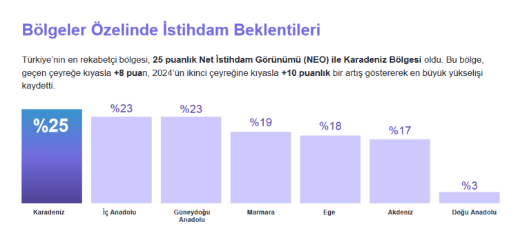 Bu ortamda, küresel istihdam görünümü istikrarlı kaldı ve mevsimsellikten arındırılmış Net İstihdam Görünümü (NEO) üst üste üçüncü çeyrekte 25 seviyesinde sabit kalırken, geçen yılın aynı dönemine göre ise 3 puan arttı. Bu veriler, işverenlerin önümüzdeki çeyrekte alım seviyelerini koruduğunu ve küresel iş gücü piyasasının dayanıklılığını sürdürdüğünü gösterdi.