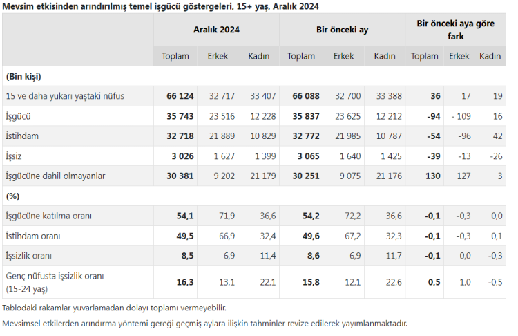 TÜİK’in açıkladığı 2024 yılının son ayına ilişkin İşgücü İstatistikleri’ne göre mevsim etkisinden arındırılmış işsizlik oranı yüzde 8,5 seviyesinde gerçekleşirken, istihdam oranı yüzde 49,5 oldu.