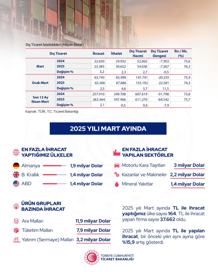 Dış ticaret açığı geçen yılın aynı ayına göre yüzde 0,5 azalış ile 7,3 milyar dolara geriledi. Mal ihracatı geçen yılın aynı ayına göre yüzde 3,2 artarak 23,4 milyar dolara yükselirken; Mart ayının en yüksek ikinci, tarihin ise en yüksek 5. aylık ihracat rakamına ulaşıldı.