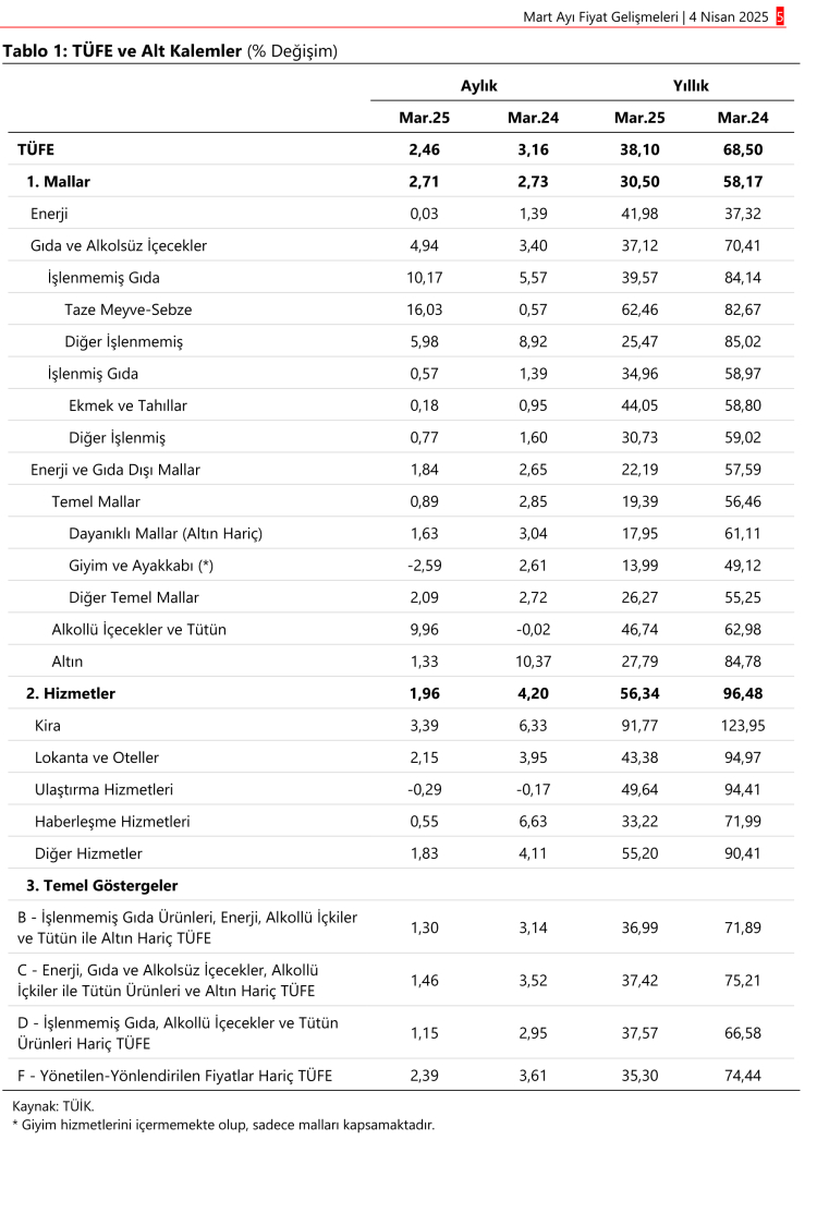 Rapora göre Mart ayında ayında tüketici fiyatlarının yüzde 2,46 arttığı, yıllık enflasyonun ise 0,95 puan azalarak yüzde 38,10’a gerilediği belirtildi.