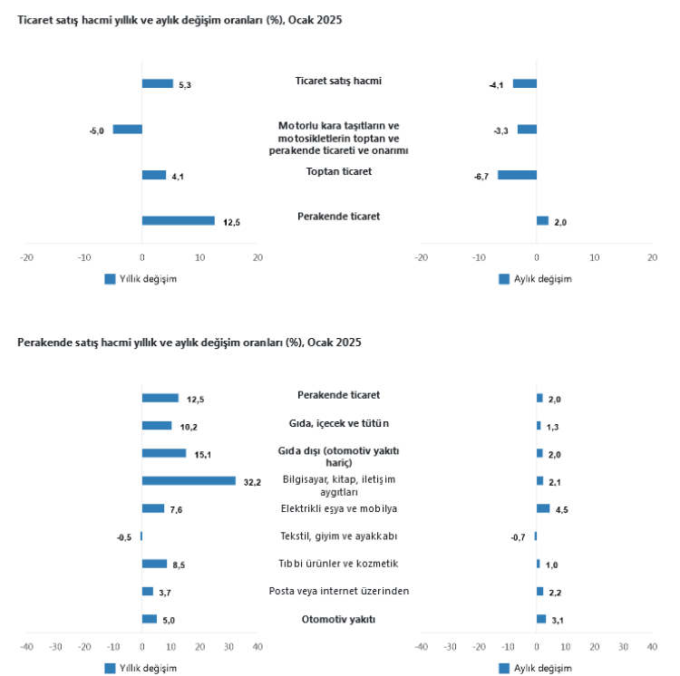 Buna göre ticaret satış hacmi 2025 yılı Ocak ayında bir önceki yılın aynı ayına göre yüzde 5,3 arttı. Aynı ayda motorlu kara taşıtlarının ve motosikletlerin toptan ve perakende ticareti ile onarımı için satış hacmi yüzde 5,0 azaldı, toptan ticaret satış hacmi yüzde 4,1 arttı, perakende ticaret satış hacmi ise yüzde 12,5 arttı.