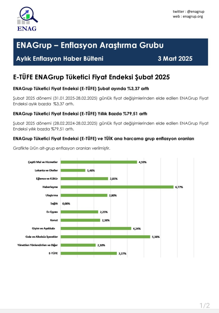 Öte yandan bağımsız enflasyon araştırma grubu ENAG’ın Tüketici Fiyat Endeksi (E-TÜFE) Şubat ayında yüzde 3,37 artarken, E-TÜFE’nin son 12 aylık artışı ise yüzde 79,51 olarak gerçekleştiği kaydedildi.