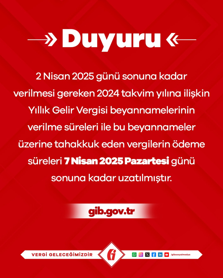 2024 yılına ilişkin normalde 31 Mart olan ancak bayram dolayısıyla bu yıl 2 Nisan 2025 tarihine kadar verilmesi gereken Yıllık Gelir Vergisi Beyannameleri’nin verilme ve ödeme sürelerini uzattı.