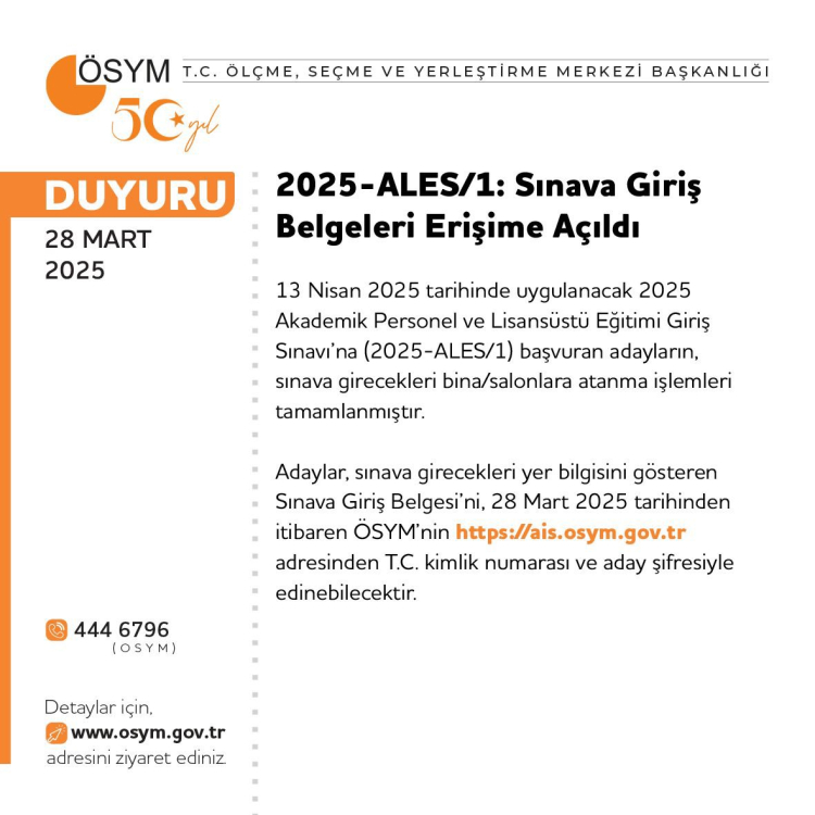 ÖSYM, 2025 Akademik Personel ve Lisansüstü Eğitimi Giriş Sınavı’na (2025-ALES/1) ile Diyanet İşleri Başkanlığı Mesleki Bilgiler Seviye Tespit Sınavı (2025-DİB-MBSTS)’na girecek adayların sınav giriş belgelerinin erişime açıldığını duyurdu.