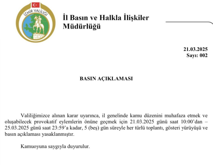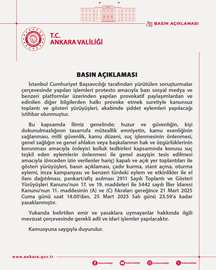 Ankara ve İzmir valilikleri ayrı ayrı aldığı kararlarda, 21-25 Mart 2025 tarihleri arasında il genelinde her türlü toplantı, gösteri yürüyüşü, basın açıklaması ve benzeri etkinliklerin yasaklandığını duyurdu.