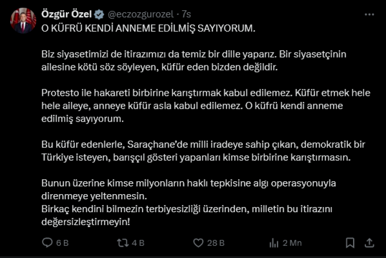 “Protesto ile hakareti birbirine karıştırmak kabul edilemez. Küfür etmek hele hele aileye, anneye küfür asla kabul edilemez” diyen Özel, “O küfrü kendi anneme edilmiş sayıyorum. Bu küfür edenlerle, Saraçhane’de milli iradeye sahip çıkan, demokratik bir Türkiye isteyen, barışçıl gösteri yapanları kimse birbirine karıştırmasın. Bunun üzerine kimse milyonların haklı tepkisine algı operasyonuyla direnmeye yeltenmesin. Birkaç kendini bilmezin terbiyesizliği üzerinden, milletin bu itirazını değersizleştirmeyin!” ifadelerini kullandı.