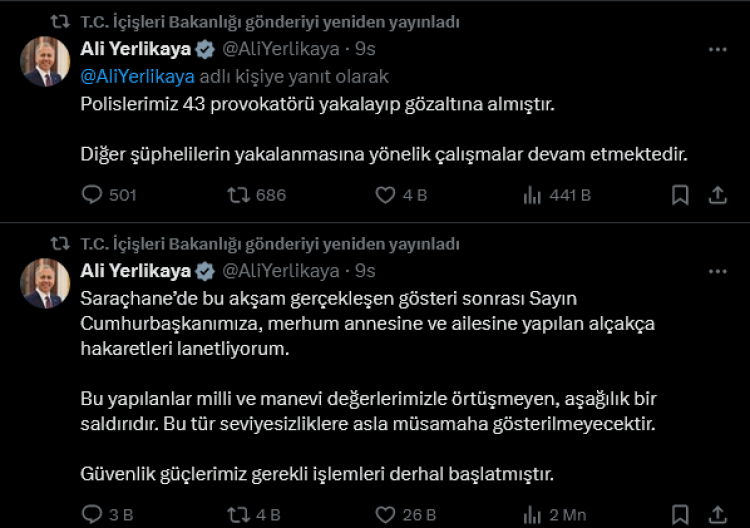 Bakan Yerlikaya, sosyal medya hesabı üzerinden yaptığı paylaşımda, “Saraçhane’de bu akşam gerçekleşen gösteri sonrası Sayın Cumhurbaşkanımıza, merhum annesine ve ailesine yapılan alçakça hakaretleri lanetliyorum. Bu yapılanlar milli ve manevi değerlerimizle örtüşmeyen, aşağılık bir saldırıdır. Bu tür seviyesizliklere asla müsamaha gösterilmeyecektir. Güvenlik güçlerimiz gerekli işlemleri derhal başlatmıştır.” ifadelerini kullandı.