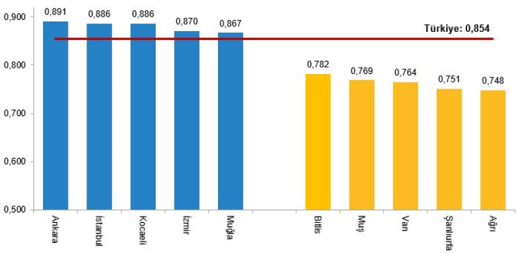 İl Seviyesinde Beşeri Kalkınma Endeksi’nin en yüksek olduğu il Ankara oldu. Ankara’yı; 0,886 ile İstanbul ve Kocaeli, 0,870 ile İzmir ve 0,867 ile Muğla izledi.