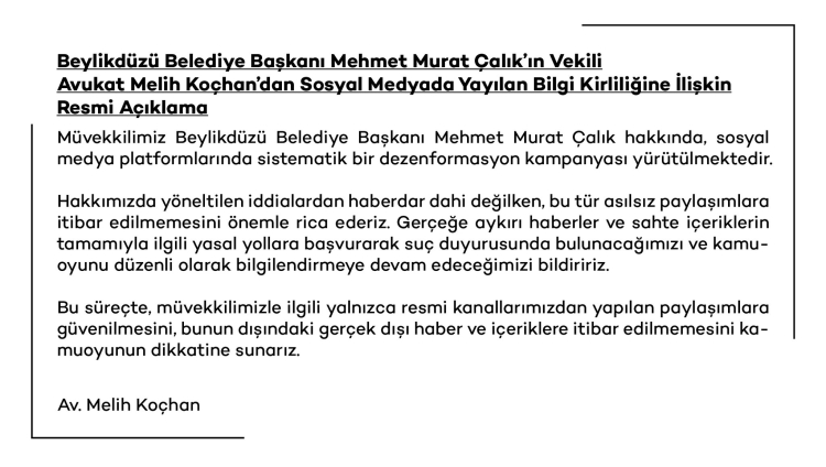 İstanbul Büyükşehir Belediye Başkanı Ekrem İmamoğlu ile birlikte gözaltına alınanlar arasında yer alan Beylikdüzü Belediye Başkanı Mehmet Murat Çalık, avukatı aracılığıyla sosyal medyada yayılan bilgi kirliliğine ilşikin resmi açıklamada bulundu.