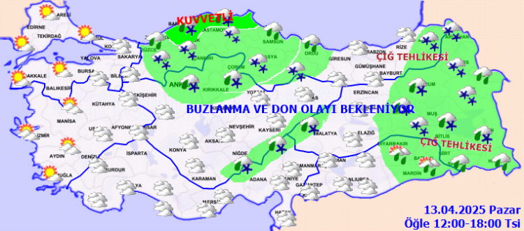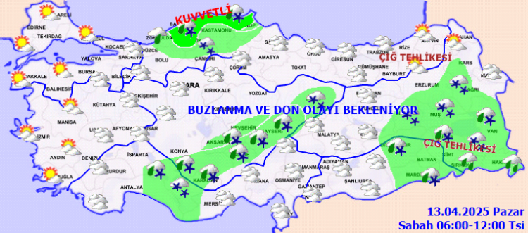 Sabah ve gece saatlerinde Marmara’nın güney ve doğusu, İç Anadolu, İç Ege, Göller Yöresi, Karadeniz’in iç kesimleri ile Doğu Anadolu’da zirai don hadisesi beklendiğinden tarımsal faaliyetlerle uğraşan vatandaşlarımızın, Meteoroloji Genel Müdürlüğü tarafından il ve ilçelere yönelik hazırlanan sıcaklık tahminlerini dikkatle takip etmeleri ve zirai don riskine karşı gerekli tedbirleri almaları önem arz etmektedir.