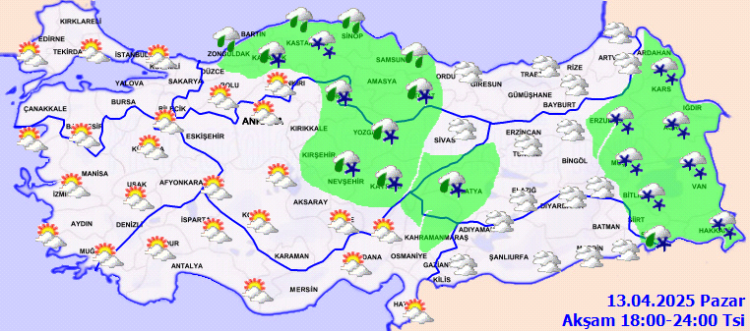 Meteoroloji Genel Müdürlüğü tarafından yapılan tahminlere göre, İç Anadolu, Batı ve Orta Karadeniz, Doğu Anadolu, Güneydoğu Anadolu’nun kuzey ve doğusu ile Sakarya, Giresun, Trabzon, Antalya’nın doğu ilçeleri, Hatay, Kahramanmaraş, Gaziantep ve Kilis çevreleri ve Osmaniye’nin doğu kesimlerinin yağışlı geçeceği tahmin ediliyor.