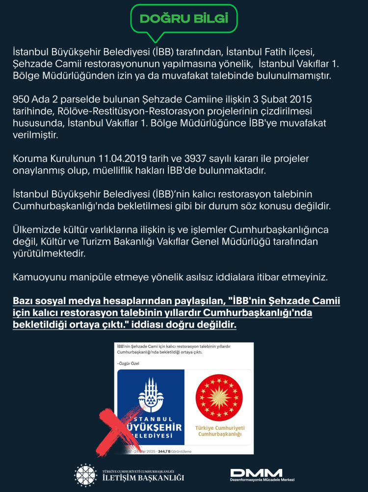 Bazı sosyal medya hesaplarından paylaşılan, “İBB’nin Şehzade Camii için kalıcı restorasyon talebinin yıllardır Cumhurbaşkanlığında bekletildiği ortaya çıktı” iddiasının doğru olmadığı belirtildi.