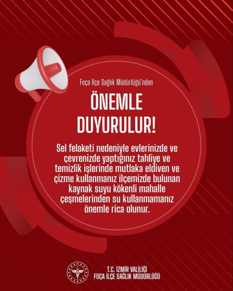 Foça İlçe Sağlık Müdürlüğü’nde önemli bir uyarıda bulunarak; “Sel felaketi nedeniyle evlerinizde ve çevrenizde yaptığınız tahliye ve temizlik işlerinde mutlaka eldiven ve çizme kullanmanız ilçemizde bulunan kaynak suyu kökenli mahalle çeşmelerinden su kullanmamanız önemle rica olunur” denildi.
