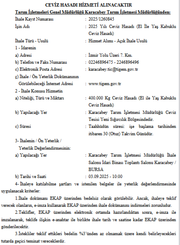 Tarım İşletmeleri Genel Müdürlüğü (TİGEM) Karacabey Tarım İşletmesi Müdürlüğü, 2025 yılı için 400 bin kg el ile yaş kabuklu ceviz hasadı hizmeti alımı ihalesi düzenliyor. İhale, 3 Eylül 2025’te gerçekleştirilecek.