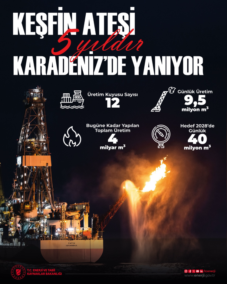 Enerji ve Tabii Kaynaklar Bakanlığı, Fatih Sondaj Gemisi’nin 5 yıl önce Karadeniz’de gerçekleştirdiği doğal gaz keşfinin yıldönümünü kutladı. Bugüne kadar 4 milyar metreküp gaz vatandaşlara sunulurken, günlük üretim 40 milyon metreküpe çıkarılacak.