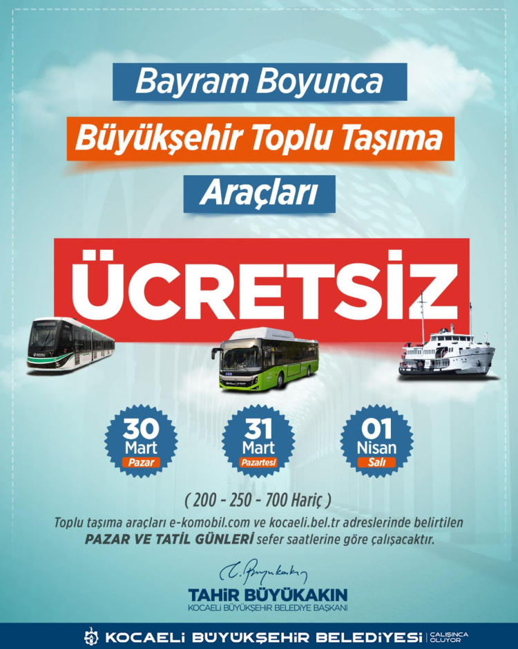 Ücretsiz ulaşım Ramazan Bayramı süresince deniz ulaşımı, belediye otobüsleri ve tramvay için geçerli olacak. Toplu taşıma araçları e-komobil ve kocaeli.bel.tr adreslerinde belirtilen pazar tatil sefer saatlerine göre çalışacak.