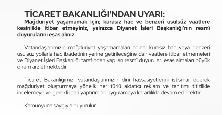 Ticaret Bakanlığı, vatandaşların mağduriyet yaşamaması için “kurasız hac” gibi usulsüz vaatlere itibar etmemeleri ve yalnızca Diyanet İşleri Başkanlığı’nın resmi duyurularını dikkate almaları gerektiği vurgulanırken, Bakanlık, dini hassasiyetleri istismar eden aldatıcı reklam ve tanıtımları titizlikle incelemeye ve gerekli yaptırımları uygulamaya devam edeceğinin altını çizdi.