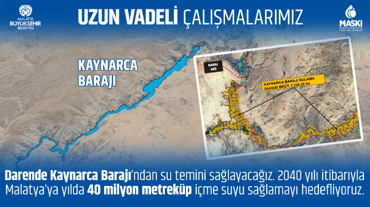 Bunun için kısa vadeli çözüm olarak kaptaj kaynağına saniyede 600 litre ilave su sağlamak için yeni kaynaklar üzerinde çalışma yapıldığını belirten Er, “Orta vadeli çözümde Karakaya Baraj Gölü’nden su temin edecek biriktirme kaynağı projesinin saha etütleri devam ediyor. Uzun vadeli stratejimiz ise Darende Kaynarca Barajı ile 2040 sonrası için yılda 40 milyon metreküp su sağlanacak” diye konuştu.