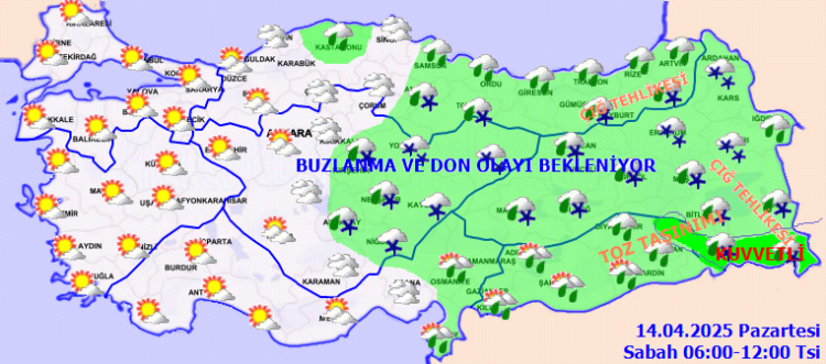 Bu sabah ve gece saatlerinde Marmara’nın güney ve doğusu, İç Anadolu, İç Ege, Göller Yöresi, Karadeniz’in iç kesimleri ile Doğu Anadolu’da zirai don hadisesi beklendiğinden tarımsal faaliyetlerle uğraşan vatandaşlarımızın, Meteoroloji Genel Müdürlüğü tarafından il ve ilçelere yönelik hazırlanan sıcaklık tahminlerini dikkatle takip etmeleri ve zirai don riskine karşı gerekli tedbirleri almaları önem arz etmektedir.