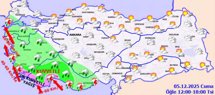 ANKARA (İGFA) – Meteoroloji Genel Müdürlüğü’nden yapılan son açıklamaya göre, 5 Aralık 2025 Cuma günü sabah saatlerinden itibaren bazı bölgelerde kuvvetli ve yer yer şiddetli yağışlar görülecek.