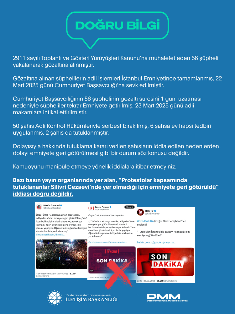 2911 sayılı Toplantı ve Gösteri Yürüyüşleri Kanunu’na muhalefet eden 56 şüpheli yakalanarak gözaltına alındığının altı çizilen açıklamada, “Gözaltına alınan şüphelilerin adli işlemleri İstanbul Emniyetince tamamlanmış, 22 Mart 2025 günü Cumhuriyet Başsavcılığı’na sevk edilmiştir. Cumhuriyet Başsavcılığının 56 şüphelinin gözaltı süresini 1 gün uzatması nedeniyle şüpheliler tekrar Emniyete getirilmiş, 23 Mart 2025 günü adli makamlara intikal ettirilmiştir. 50 şahıs Adli Kontrol Hükümleriyle serbest bırakılmış, 6 şahsa ev hapsi tedbiri uygulanmış, 2 şahıs da tutuklanmıştır. Dolayısıyla hakkında tutuklama kararı verilen şahısların iddia edilen nedenlerden dolayı emniyete geri götürülmesi gibi bir durum söz konusu değildir. Kamuoyunu manipüle etmeye yönelik iddialara itibar etmeyiniz” ifadeleri yer aldı.