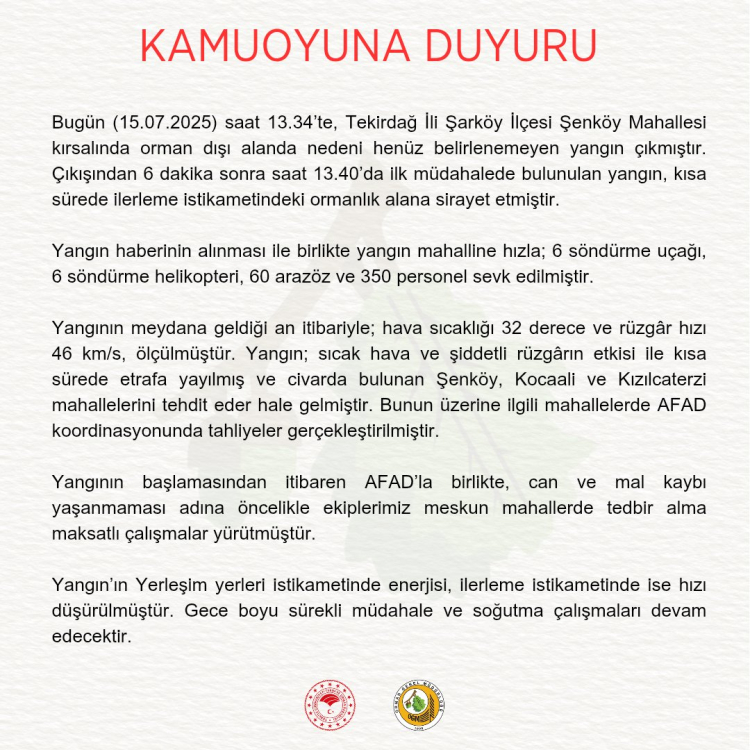 Yangına 14 uçak, 20 helikopter, 116 arazöz, 20 iş makinesi ve 742 personel ile müdahale edilirken, Tekirdağ Valiliği, vatandaşları yangın bölgesine yaklaşmamaları konusunda uyardı.