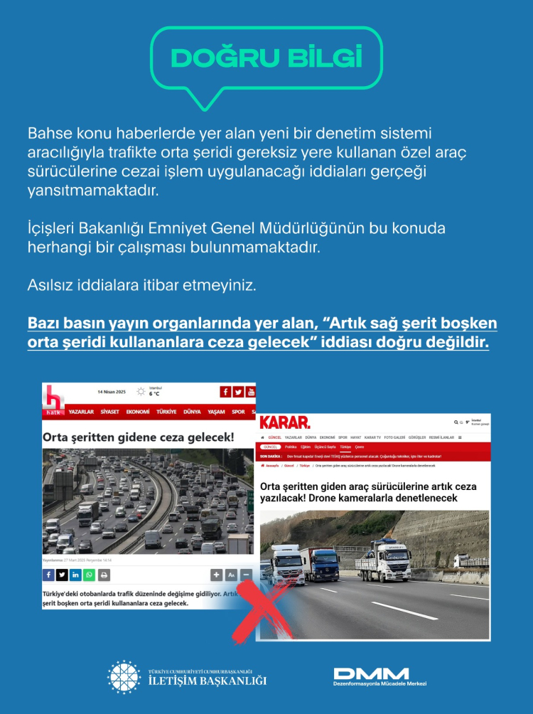 ANKARA (İGFA) – İletişim Başkanlığı bünyesindeki Dezenformasyonla Mücadele Merkezi, sağ şerit boşken orta şeridi kullananlara ceza geleceği iddialarına ilişkin açıklama yaptı.