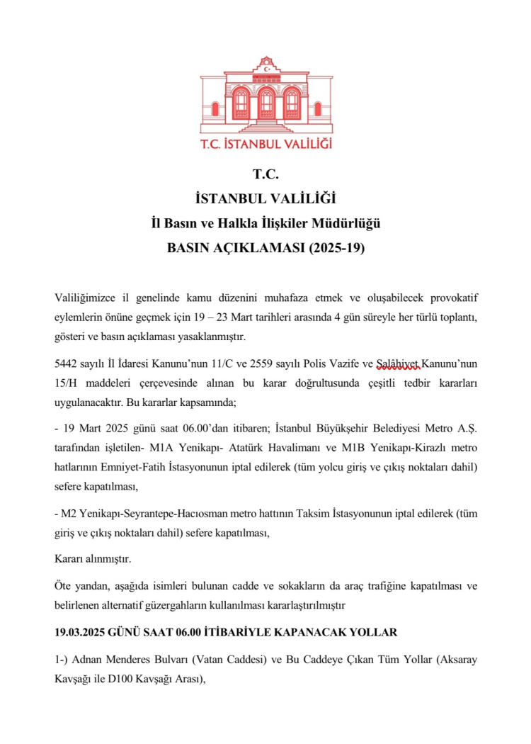 İstanbul Valiliği, kent genelinde kamu düzenini muhafaza etmek ve oluşabilecek provokatif eylemlerin önüne geçmek için 19 – 23 Mart tarihleri arasında 4 gün süreyle her türlü toplantı, gösteri ve basın açıklamasının yasaklandığını duyurdu.