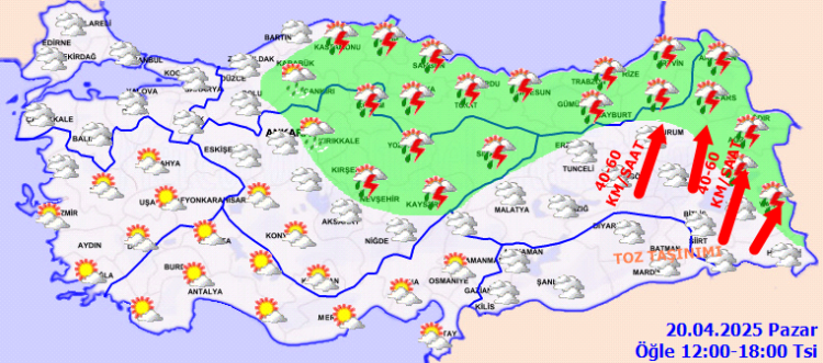 Buna göre Türkiye genelinin parçalı ve çok bulutlu, İç Anadolu’nun kuzeydoğusu, Batı Karadeniz’in iç kesimleri, Orta ve Doğu Karadeniz, Doğu Anadolu’nun kuzeydoğusu, Bilecik, Ankara, Çankırı, Nevşehir, Kayseri, Sinop, Erzincan ve Van çevreleri ile Kütahya’nın, Eskişehir’in, Erzurum’un kuzey, Kastamonu’nun kıyı kesimlerinin yerel olmak üzere sağanak ve gök gürültülü sağanak yağışlı geçeceği tahmin edildi.