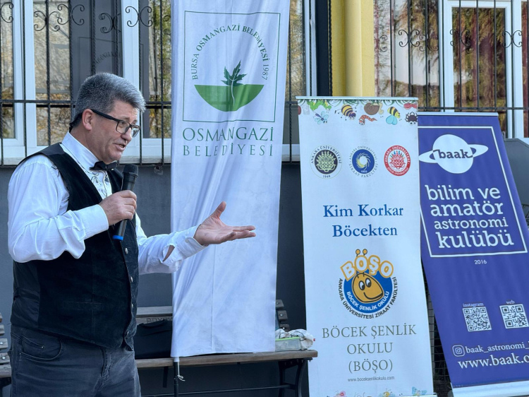 Bilim ve Amatör Astronomi Kulübü (BAAK) Derneği yönetimi üyesi Canan Bilgi’nin moderatörlüğünü yaptığı “Osmangazi Bilim Buluşmaları” etkinliği, Büyük Önder Mustafa Kemal Atatürk ve aziz şehitlerimiz anısına yapılan saygı duruşu ve İstiklal Marşı’nın okunmasıyla başladı. Etkinliğe katılan Ankara Üniversitesi Böcek Bilimci Prof. Dr. Cem Özkan, bilgisi, heyecanı ve performansı ile katılımcılara eğlenceli bir öğrenme ortamı sundu. Yapılması planlanan teleskopla gökyüzü gözlemi, hava muhalefeti nedeniyle gerçekleştirilemedi.