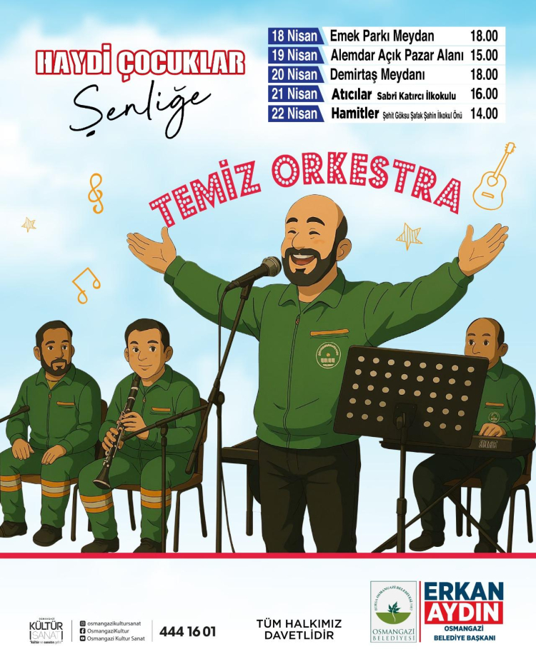 23 Nisan Ulusal Egemenlik ve Çocuk Bayramı kutlamalarının ana merkezi olacak olan Osmangazi Meydanı’nda etkinlikler 19 Nisan Cumartesi günü başlayacak. Meydanda kurulacak olan sahnede her akşam farklı bir konser ve gösteri düzenlenecek. 18 Nisan Cuma günü Liseli Orkestralar Yarışıyor Finalistleri, 19 Nisan Pazar günü Çocuk Halk Dansları Gösterileri, 20 Nisan Pazar günü Osmangazi Gençlik Orkestrası ve Korosu, 21 Nisan Pazartesi günü Osmangazi Belediyesi Temiz Orkestra ve 22 Nisan Salı günü Grup Date, sahne alarak çocuklara unutulmaz bir bayram yaşatacak. 23 Nisan Çarşamba akşamı gerçekleşecek olan Ecem Boyacı konseri ile de bayram coşkusu zirve yapacak.