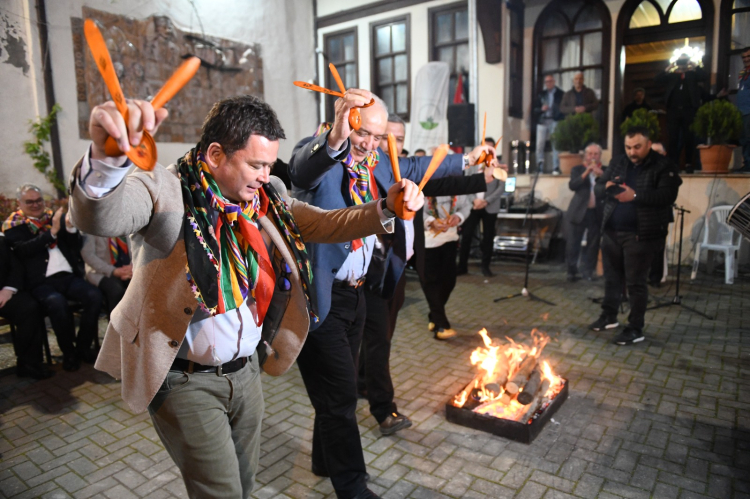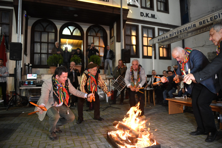 BURSA (İGFA) – Bursa’da Osman Gazi’yi Anma ve Bursa’nın Fetih Günü Etkinlikleri kapsamında düzenlenen geleneksel köy düğünü etkinliğinin en önemli bölümlerinden biri olan kınası gecesi ile Türk kültüründeki bin yıllık kına eğlencesi geleneği günümüze taşındı. DAĞ-DER Kültür Merkezi’nde gerçekleşen kına gecesi etkinliği, birbirinden renkli görüntülere sahne oldu. Kına eğlencesi öncesi gençler, Osmangazi Belediye Başkanı Erkan Aydın’ı davul ve zurnayla karşıladı. Büyük bir coşkuyla yapılan karşılama merasiminin ardından Başkan Aydın, yol boyunca oynanan yörük oyunları eşliğinde DAĞ-DER Kültür Merkezi’ne getirildi. DAĞ-DER yönetimi ile çok sayıda vatandaşın katıldığı kına eğlencesi, halk oyunları ekiplerinin ateş etrafındaki oyunları ile başladı. Kına gecesinde Başkan Aydın da oyunlara eşlik etti.